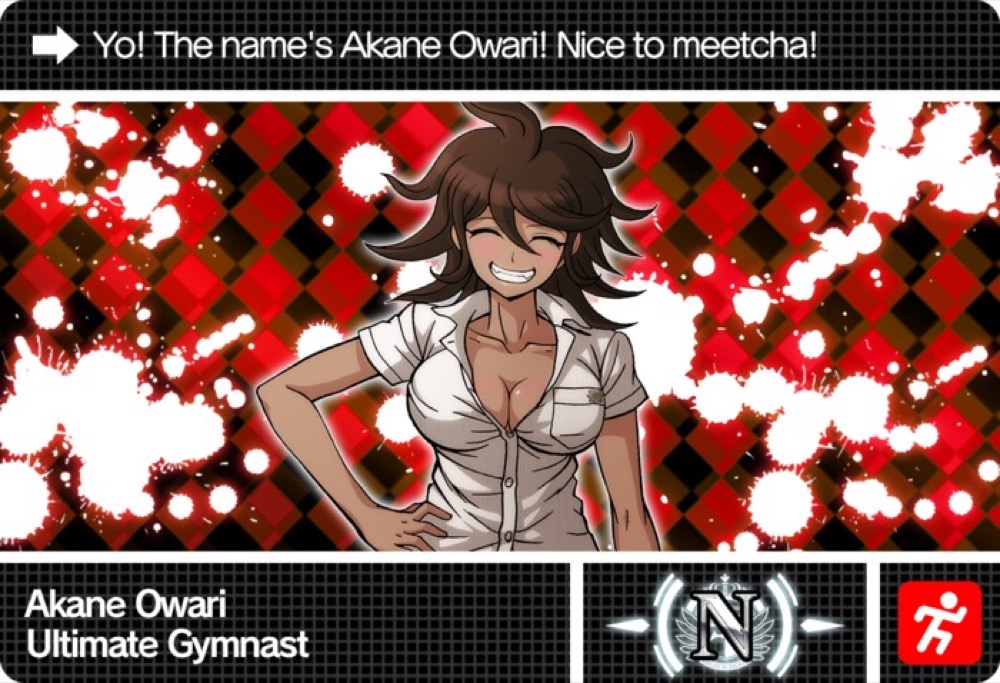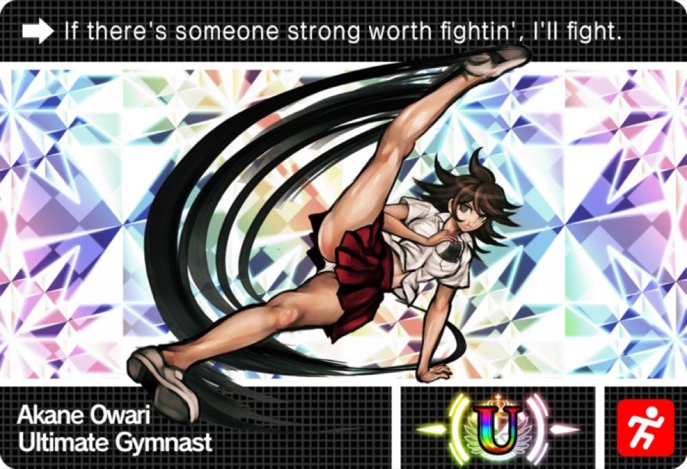 AKANE Owari est connu pour être une super athlète. Rien qu’en regardant son corps, il est difficile de croire qu’elle est bel et bien lycéenne ! Les seules choses auxquelles elle pense sont son prochain repas et son prochain combat. Bien qu’elle l’Ultime Gymnaste, AKANE n’a jamais reçu d’entraînement réel, aussi sa connaissance de la gymnastique est elle un peu maladroite et ses routines principlament improvisées. Mais sa capacité athlétique au niveau Ultime est suffisante pour compenser la différence. Quand elle trouve l’envie de se produire, ses routines sont splendides à voir. Mais si elle ne la trouve pas suffisament, elle perd rapidement intérêt et commence à changer tout et n’importe-quoi de manière surprenante. En raison de cette tendance, Akane a pour réputation d’être une fauteuse de trouble peu fiable.