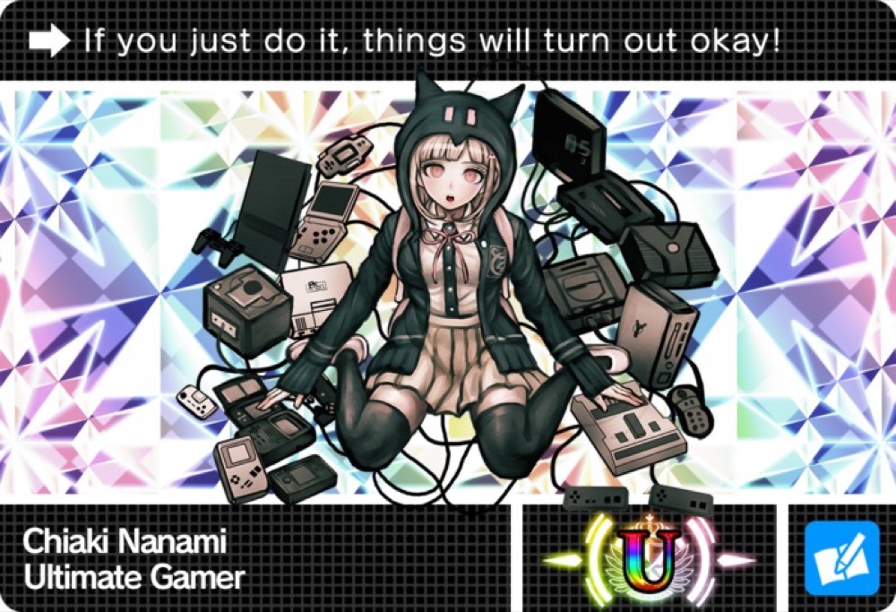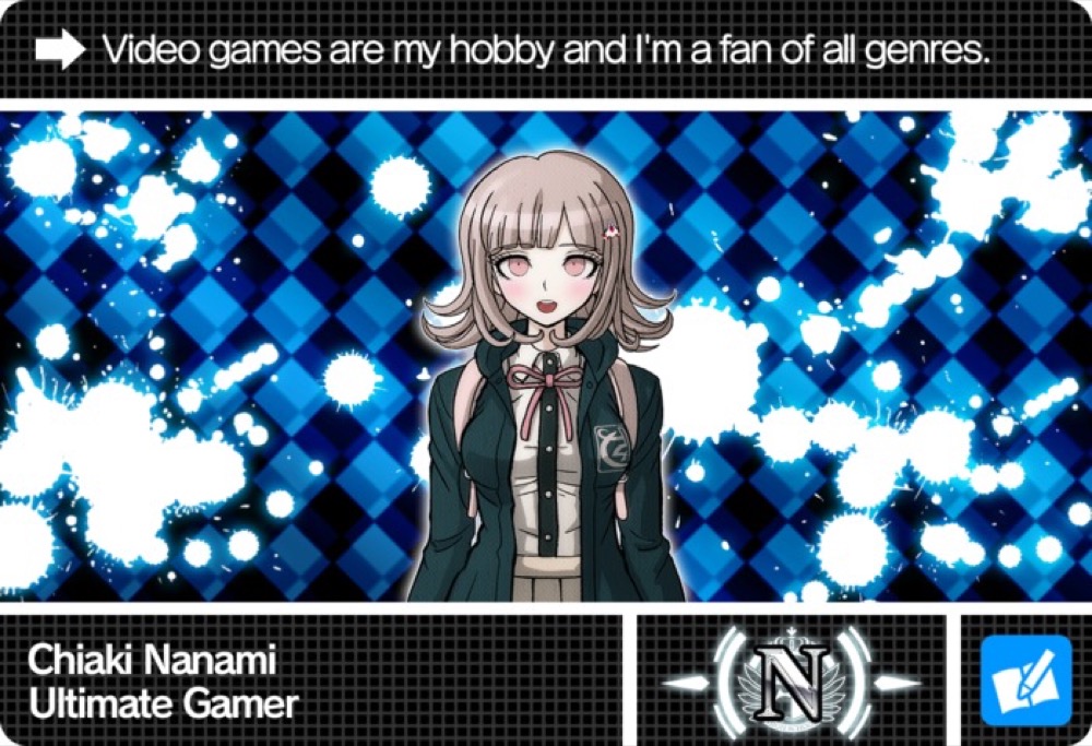 En tant que l’Ultime Gameuse, CHIAKI Nanami a énormément de connaissances en matière de tous genres de jeux-vidéos. Elle a tendance à prendre le temps de réunir ses pensées avant de parler, aussi ses conversations avec les personnes qu’elle rencontre sont-elles souvent assez lentes.