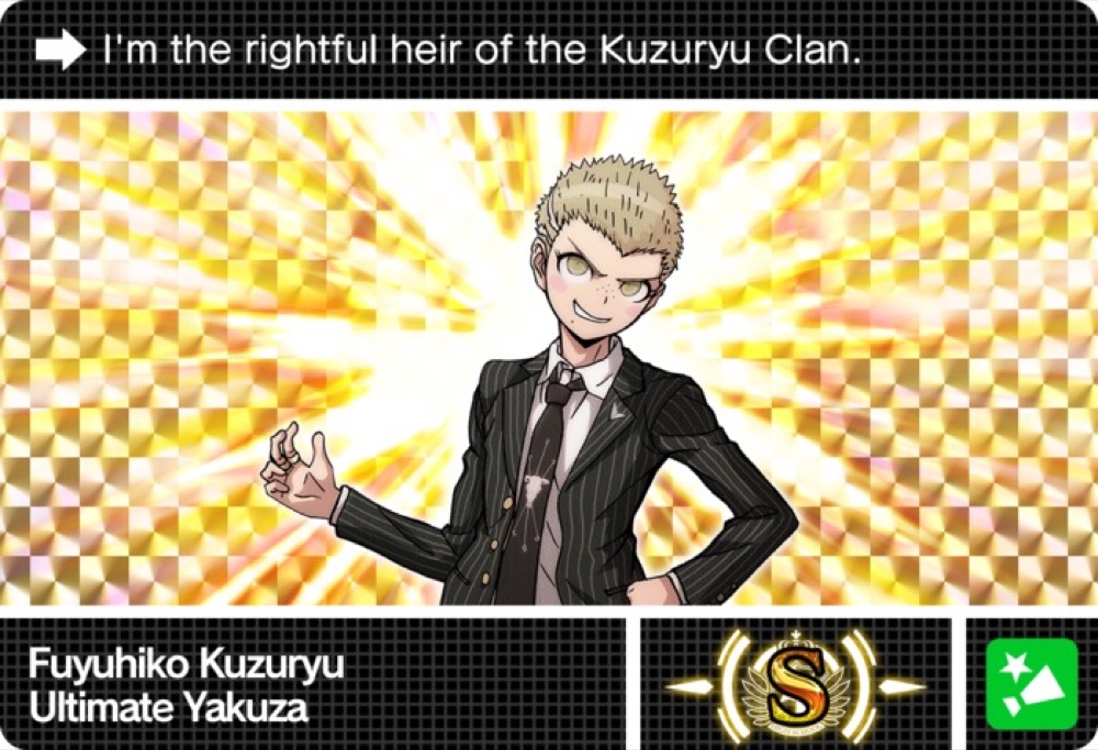 Fuyuhiko Kuzuryû est l’hériter du Clan Kuzuryû, le groupe de crime organisé le plus grand de la nation avec un total de 30 000 membres. Au sujet du monde sous-terrain du crime, il est votre homme, et c’est pour cette raison qu’il est connu comme l’Ultime Mafieux. Fuyuhiko déteste les foules et refuse de bien s’entendre avec qui que ce soit, comme l’indiquent son attitude amère et sa mauvaise langue.