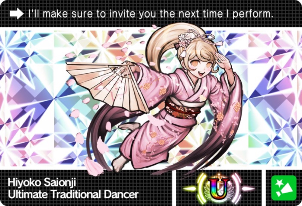 Ne vous laissez pas méprendre par l’apparence et la voix enfantines d’HIYOKO Saionji ; elle est définitivement lycéenne. Bien qu’elle ne soit encore que débutante dans sa carrière de danseuse folklorique, l’industrie de danse Japonaise a déjà de grands espoirs en l’Ultime Danseuse Folklorique. Elle s’est déjà produite à l’étranger de nombreuses fois, et sa popularité auprès d’audiences plus jeunes fait d’elle une rareté dans la communauté de danse. Cela dit, beaucoup de ses fans sont des hommes aux goûts « uniques » en matière de divertissement, ce qui biaise possiblement sa popularité.