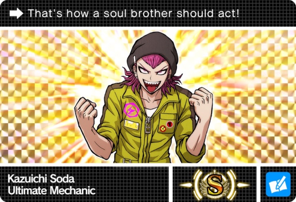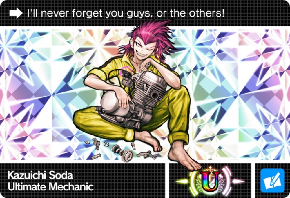 Lorsqu’il s’agit de réparer des machines, personne n’est meilleur que l’Ultime Mécanicien. KAZUICHI Sôda porte fièrement son apparence tape-à-l’œil et son attitude cool, ce qui rend vraiment surprenant la découverte de sa froussardise. Même les plus petits incidents suffisent à le surprendre et lui causer une crise de panique totale. Étant donné sa tendance à flipper pour un rien, c’est un mystère qu’il parvienne tout de même à parler posément de son crush sur SONIA.