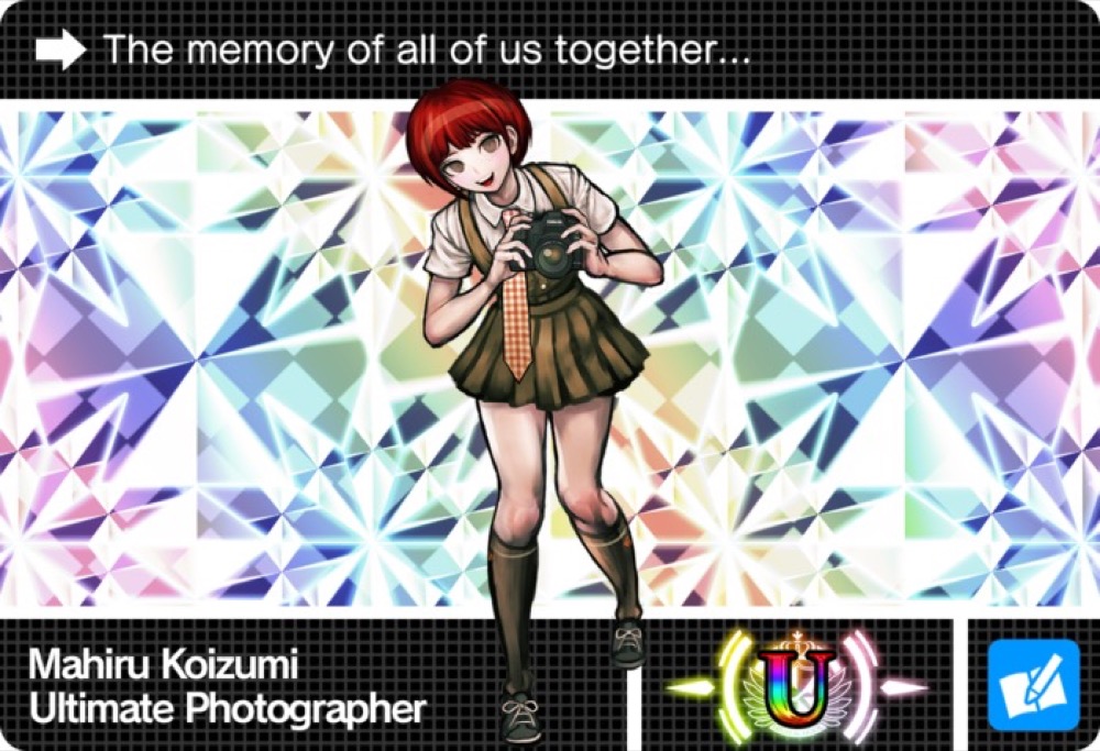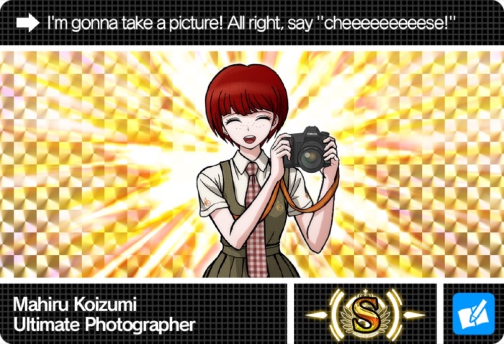 MAHIRU Koizumi a déjà remporté plusieurs prix pour sa photographie, et est réputée pour ses capacités à prendre des photos grandioses des gens, faisant d’elle l’Ultime Photographe. Bien qu’elle soit très attentionnée envers ses amis et douée pour prendre soin des autres, elle a des standards très hauts pour les garçons. Dès qu’elle suspecte un garçon de ne pas être fiable, elle commence à lui faire la morale. D’ailleurs, quand elle rencontre Hajime, elle se dit de se rappeler qu’il est « Hajime le non-fiable ».