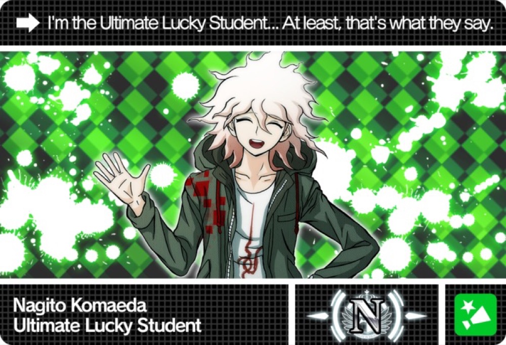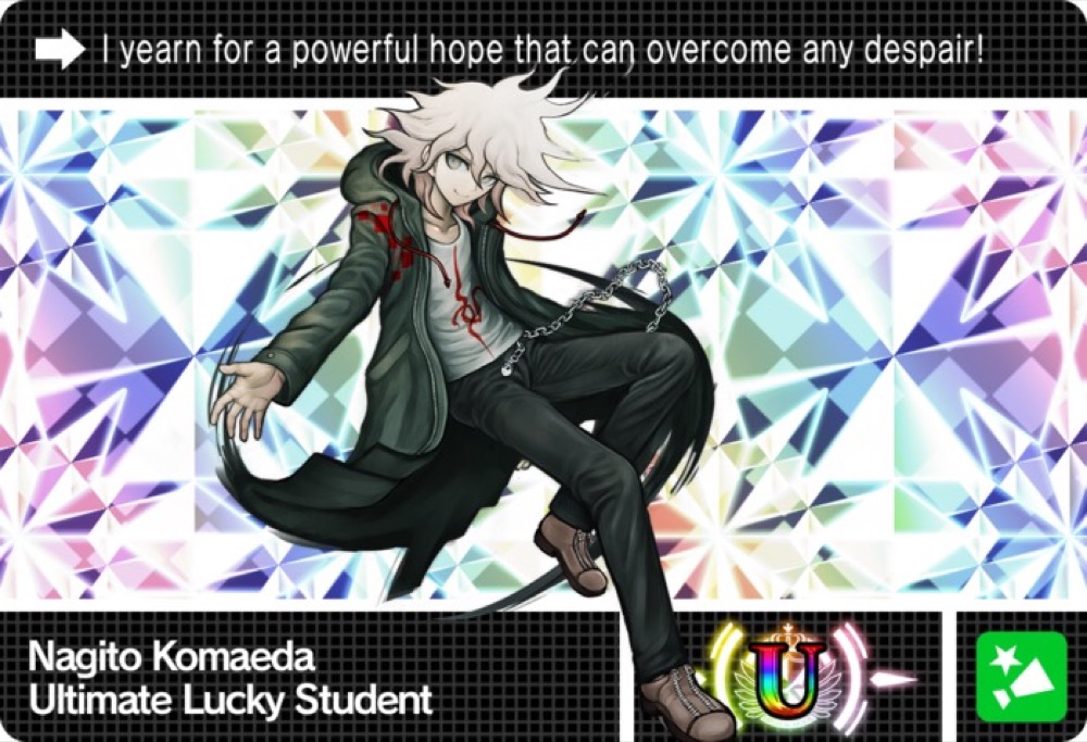 NAGITO Komaeda est le premier personnage avec qui Hajime fasse connaissance. Intégré à l’école grâce au tirage au sort annuel, il porte le titre d’Ultime Chanceux. Même quand il est entouré par le désespoir, NAGITO continue à croire en ses amis et le pouvoir de l’espoir. Bien qu’il ne semble pas fiable, il est toujours le premier à conseiller et s’occuper de HAJIME. Malgré son attitude polie, il lui arrive d’être dur, mais n’a apparemment pas pour but de paraître malpoli ou insensible.