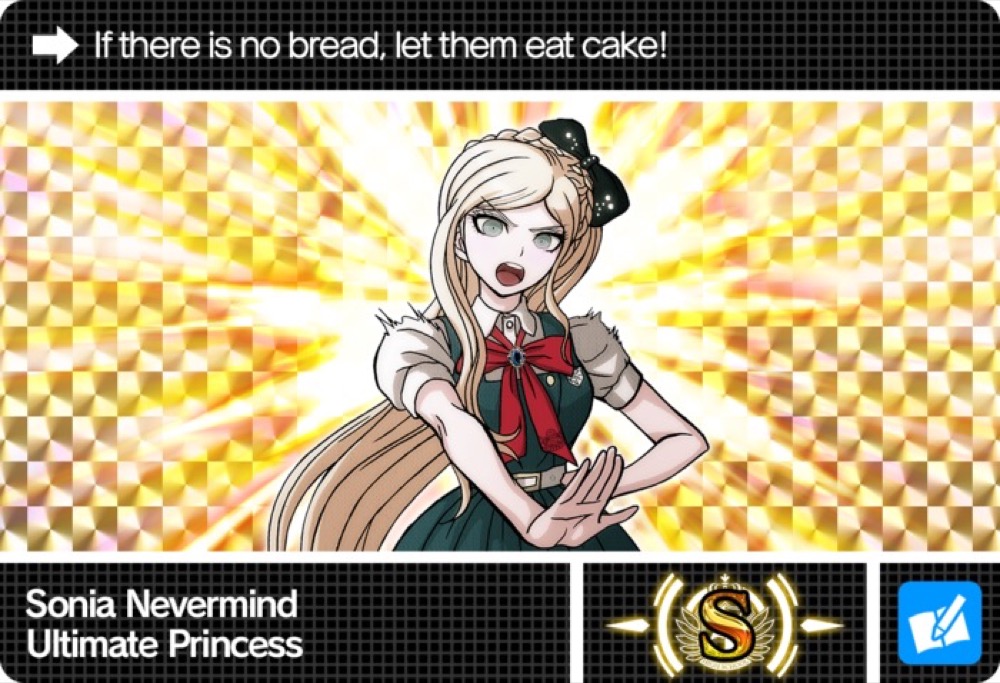 SONIA Nevermind est un étudiant étranger venant d’un petit pays Européen nommé Novoselic. Avec sa peau blanc porcelaine, yeux clairs éclatants, et cheveux étincelants, elle émet un charme mystérieux qui captive quiconque la voit. Étant donné son statut d’Ultime Princesse, SONIA n’a jamais eu d’amis qui correspondent réellement à son statut social. Pour cette raison, elle est ravie de l’opportunité que lui offrent ses études à l’Académie Kibôgaline de rencontrer des personnes de son âge. Bien qu’elle ait tendance à utiliser de l’argot et des jurons de manière inappropriée, sa grâce et sa beauté peuvent asujettir qui que ce soit à s’agenouiller devant elle sans même s’en rendre compte.