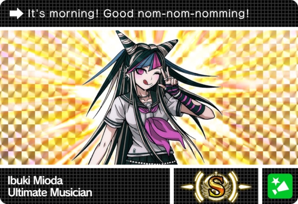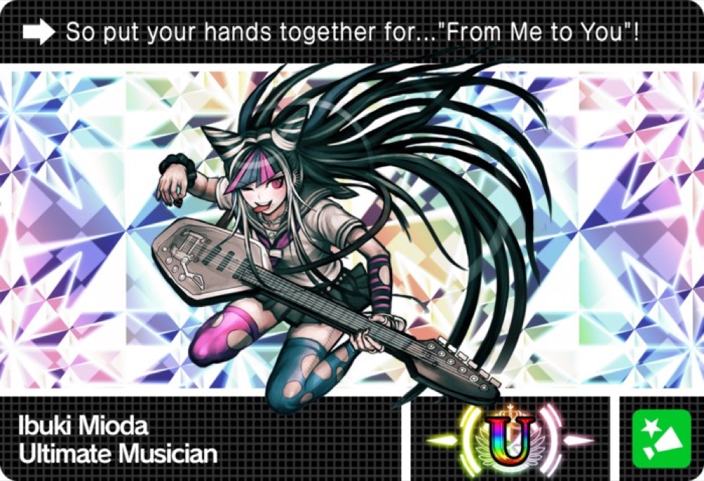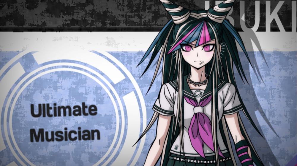 En tant que l’Ultime Joueuse de Musique Légère, Ibuki Mioda était la guitariste principale d’un groupe de musiciennes qui était super populaire chez les lycéennes. Alors que leur grand succès, « After School Poyoyon Hours » s’est vendu à hauteur de plus d’un million de copies, Ibuki a quitté le groupe en raison de différences créatives et poursuit à présent une carrière solo. Ibuki est une fille très énergique qui se moque complètement des situations sérieuses. Même entourée de morts, elle oublie souvent qu’elle est censée s’inquiéter.
