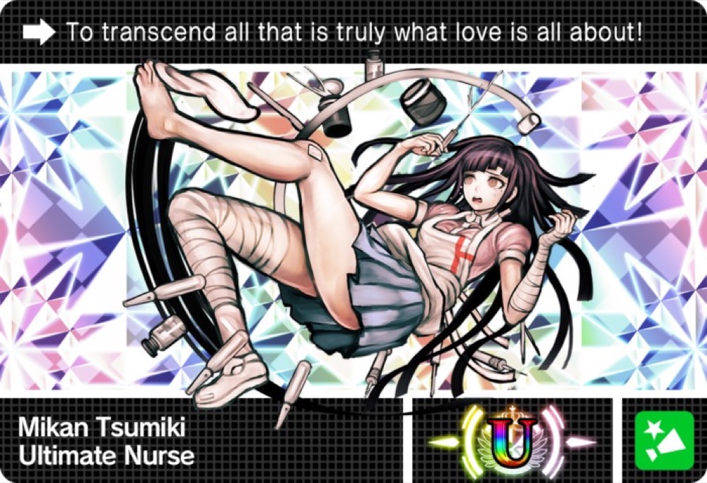En tant que l’Ultime Infirmière, Mikan Tsumiki dédie sa vie à aider les autres. Cependant, sa nervosité et son manque complet de confiance en elle ont profondément affecté sa vie sociale. Avant son arrivée à l’Académie Kibôgamine, Mikan n’avait pas un seul ami. Pour cette raison, elle tente de rentre tout le monde heureux dans l’espoir d’être acceptée, même entourée par la mort et le désespoir, mais elle semble toujours se rater d’une manière ou d’une autre. Pour chaque conversation, elle a prévu au moins 5000 sujets à l’avance…