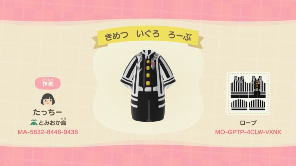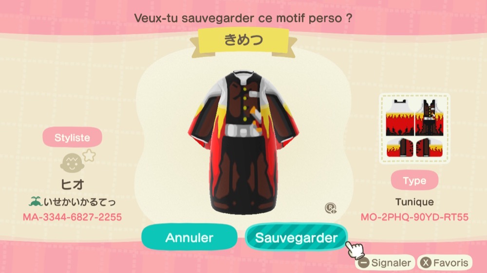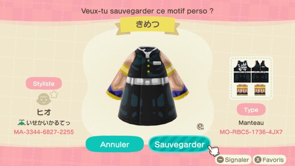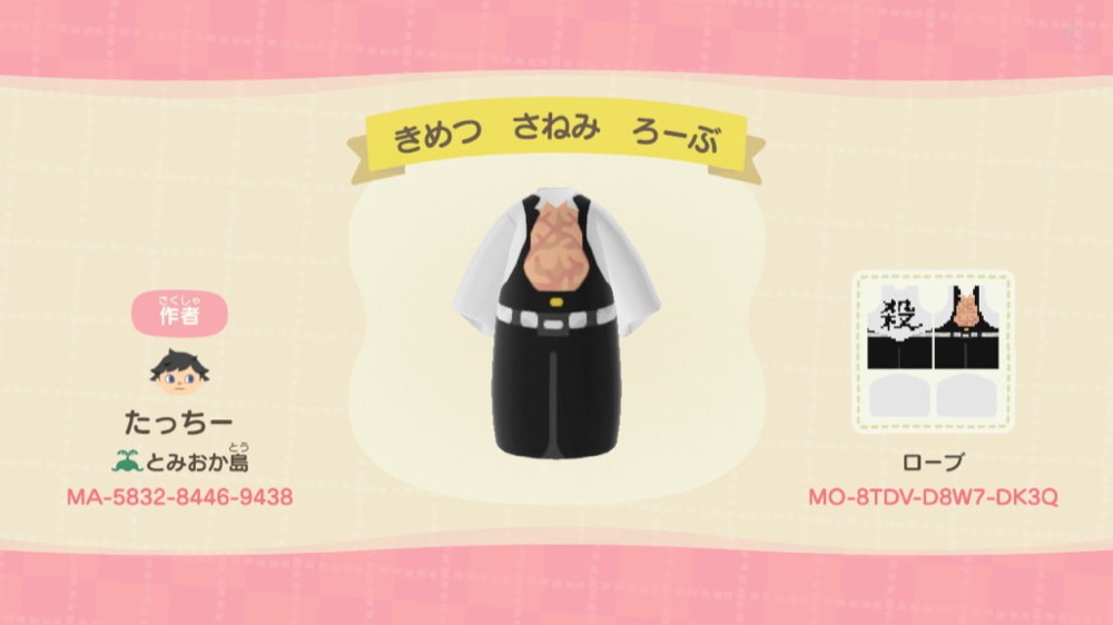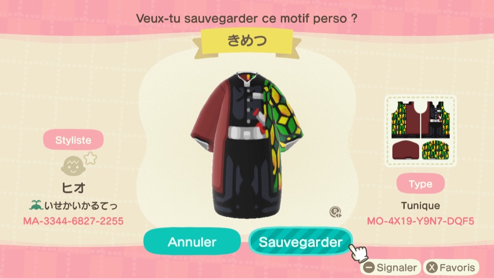 2020.10.11Dans cet article, nous présenterons les motifs persos de RUI de Demon Slayer qui peuvent être utilisés dans Animal ...