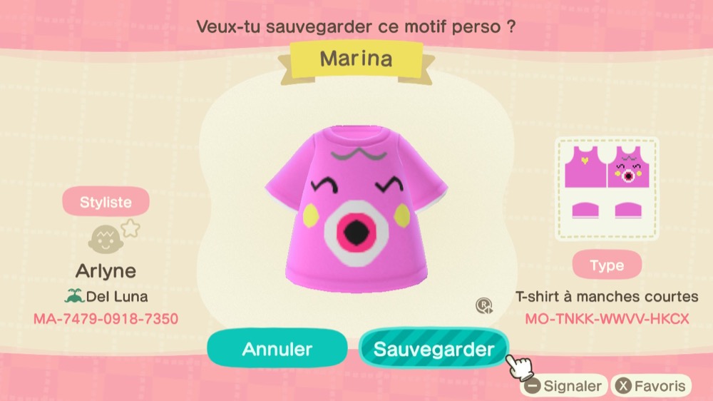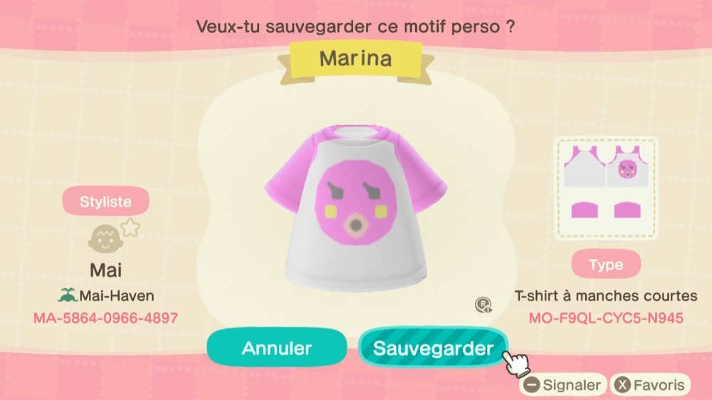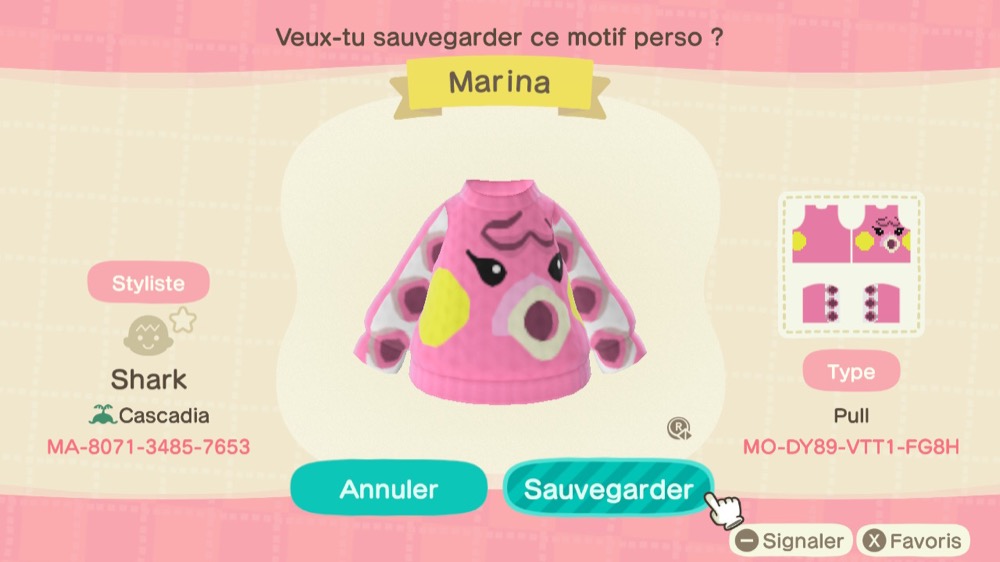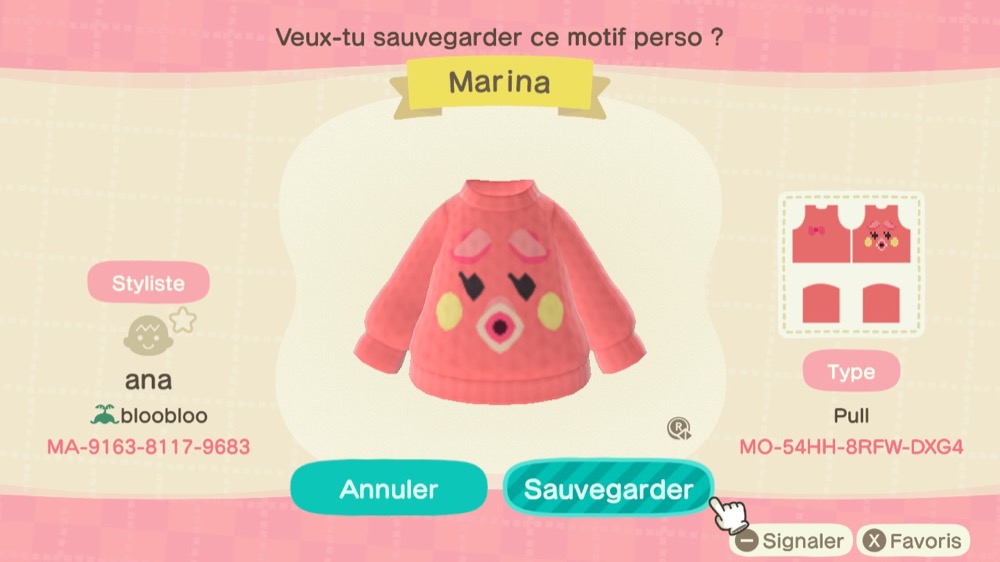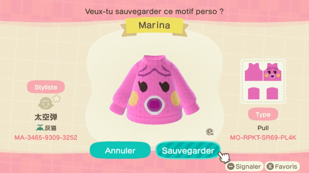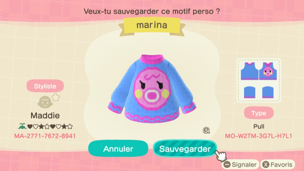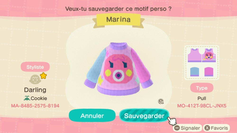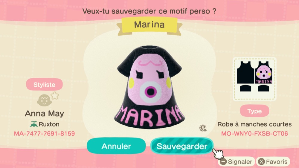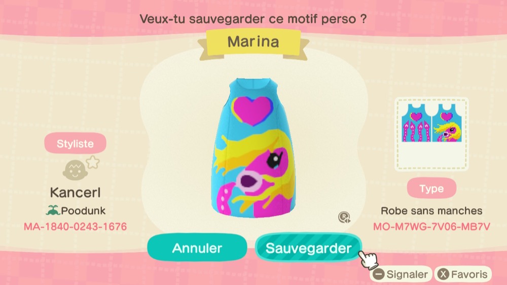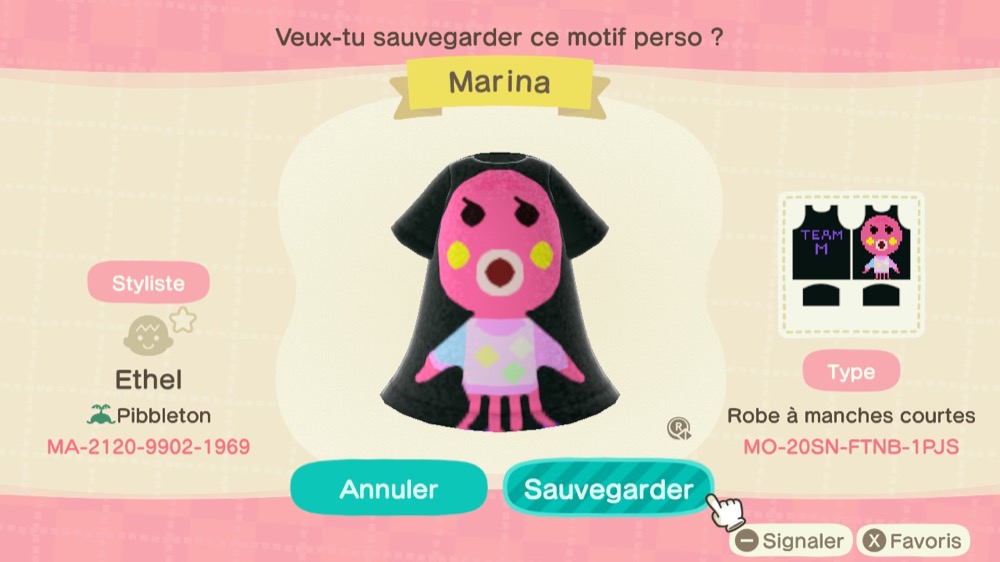 Dans le jeux video Animal Crossing New Horizons, vous povez télécharger de nombreux vêtement que la communauté créative et ingénieuse du jeu s’en donne à coeur joie et propose pour habiller vos villageois. Sur Internet, il y a de nombreux de motifs persos inspirés par les Résidents d’île ! Cette fois, C’est au tour de MARINA!!!!