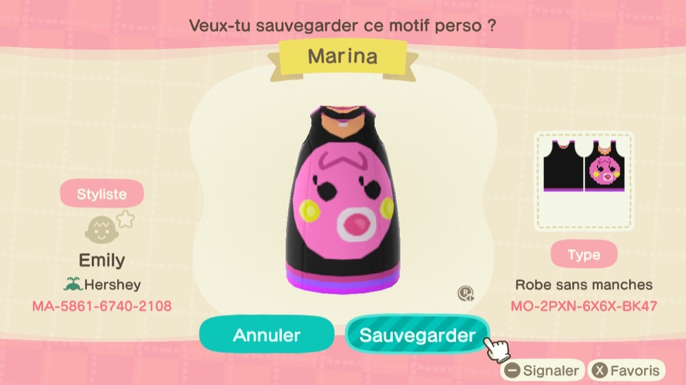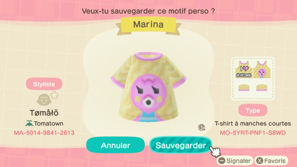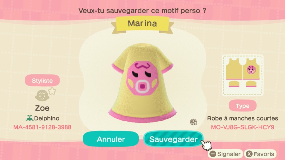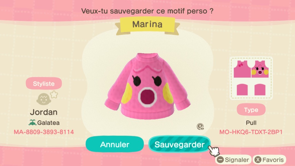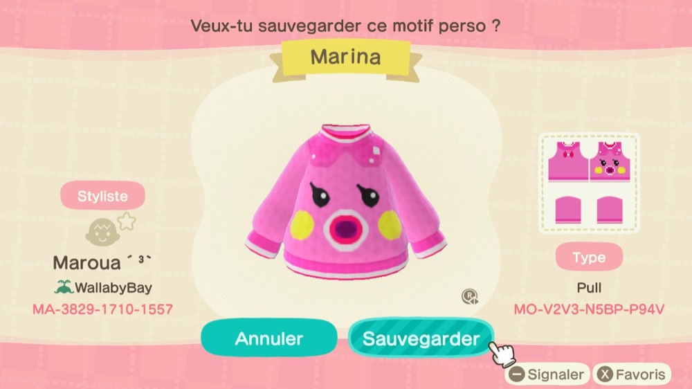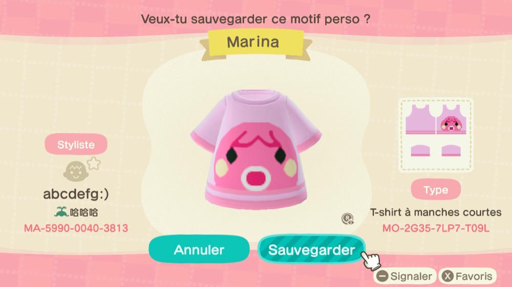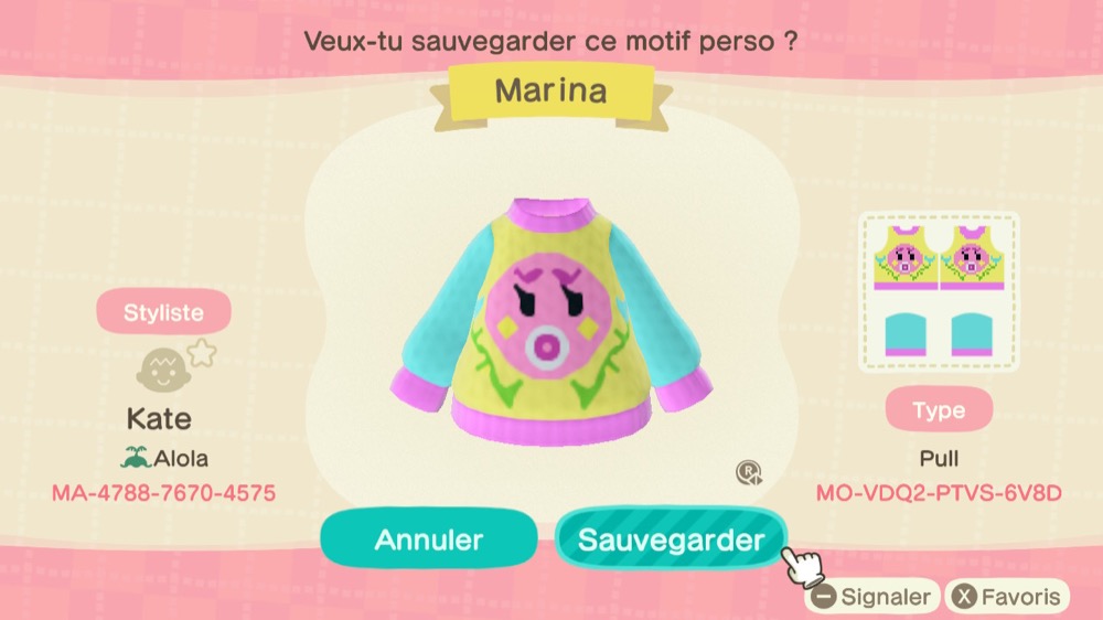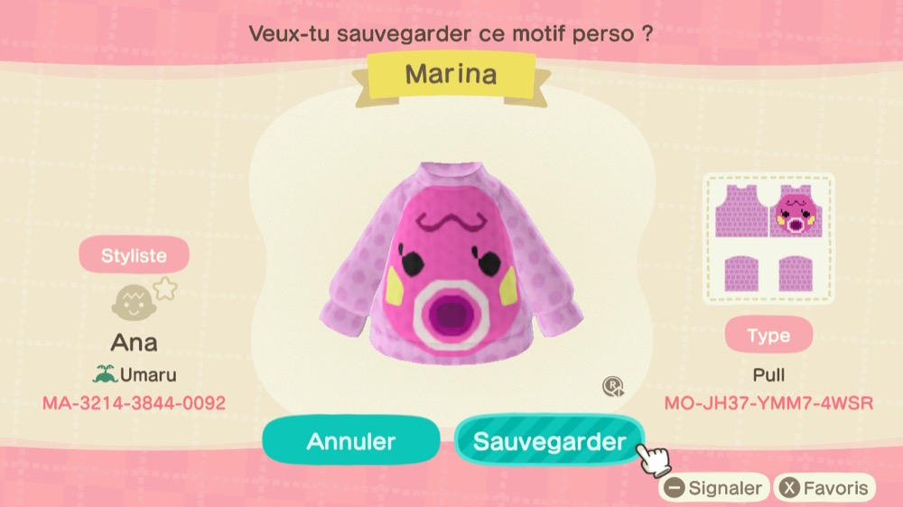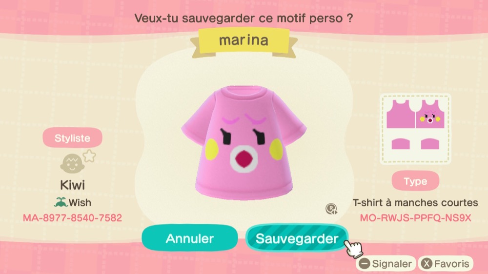 Dans le jeux video Animal Crossing New Horizons, vous povez télécharger de nombreux vêtement que la communauté créative et ingénieuse du jeu s’en donne à coeur joie et propose pour habiller vos villageois. Sur Internet, il y a de nombreux de motifs persos inspirés par les Résidents d’île ! Cette fois, C’est au tour de MARINA!!!!