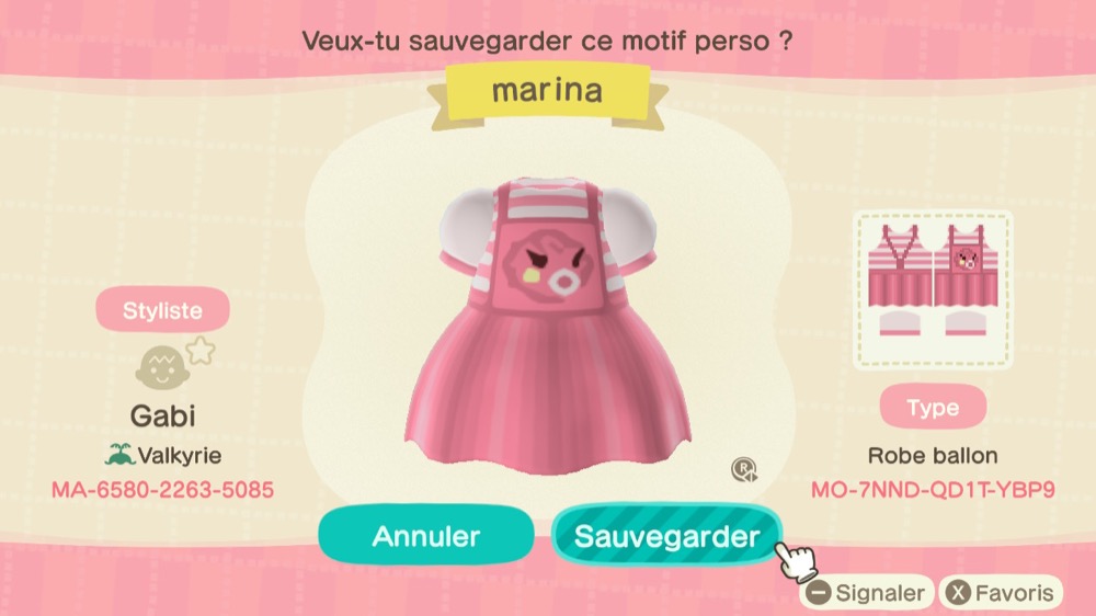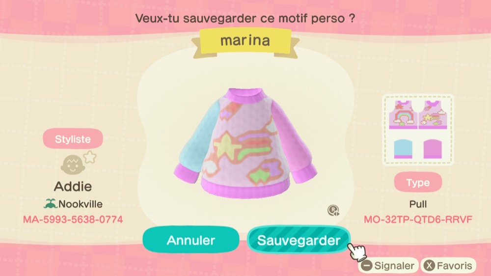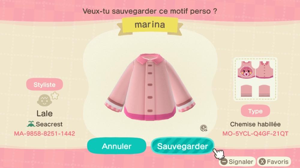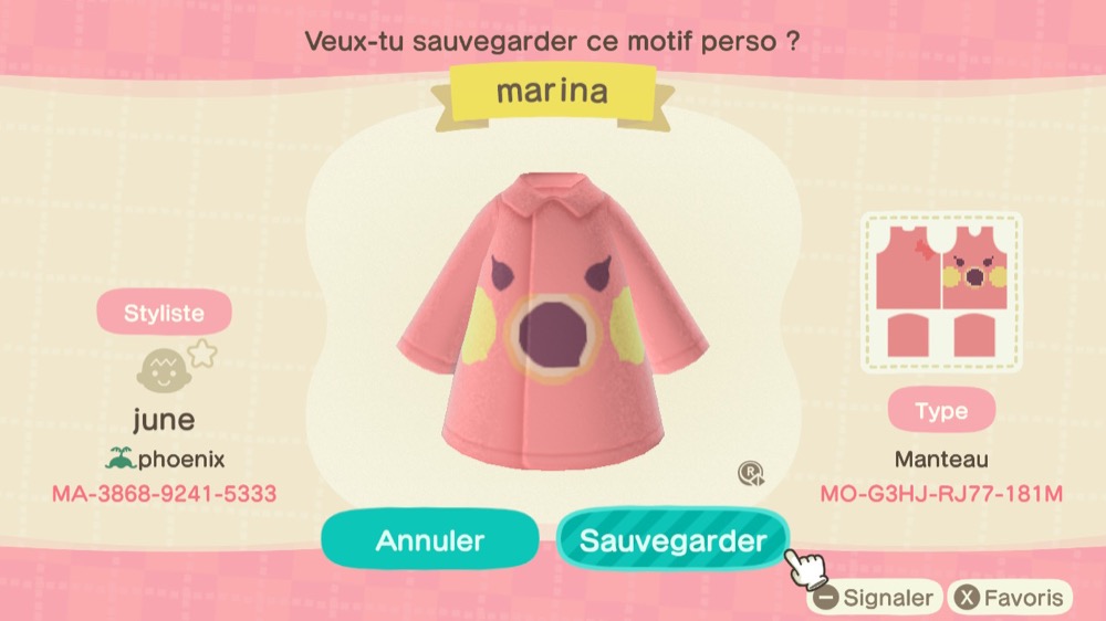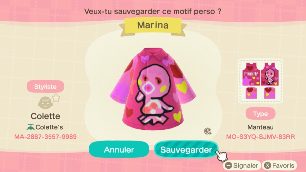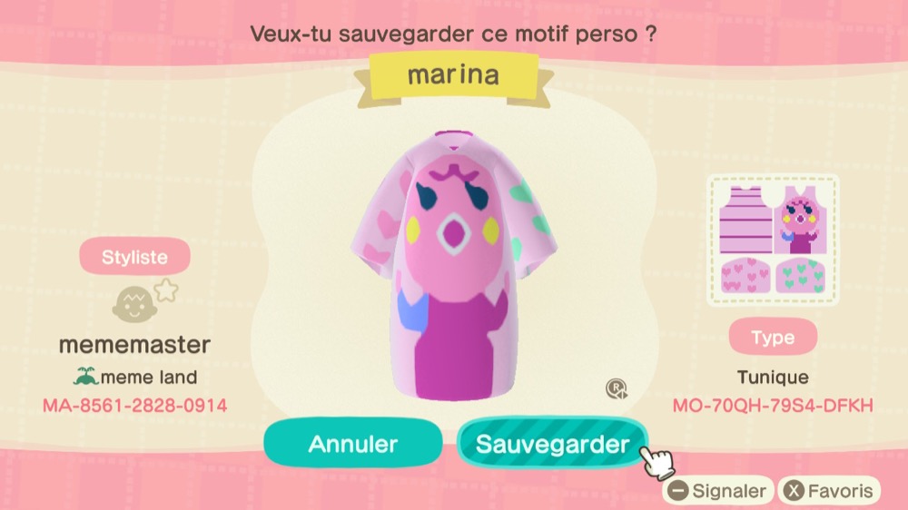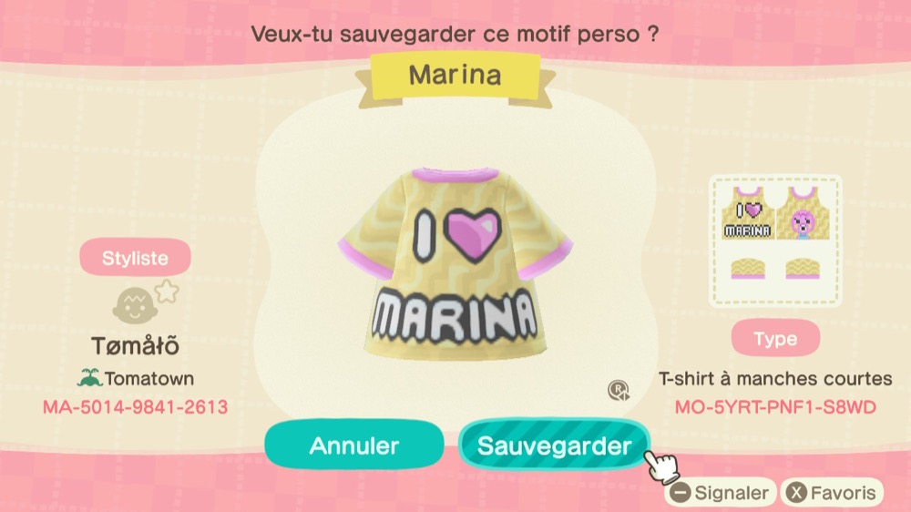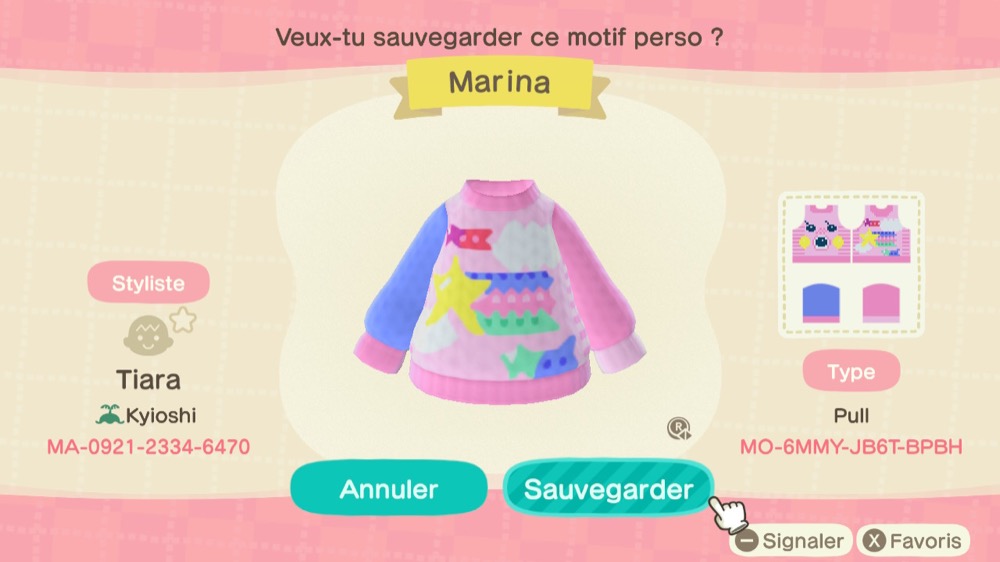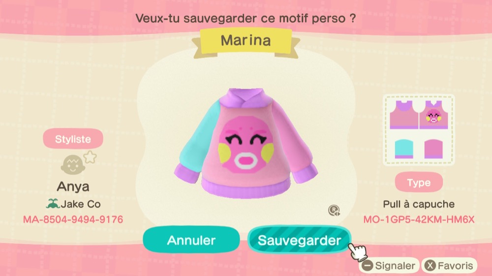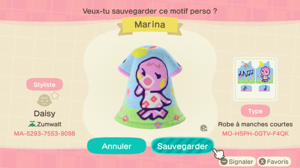 Dans le jeux video Animal Crossing New Horizons, vous povez télécharger de nombreux vêtement que la communauté créative et ingénieuse du jeu s’en donne à coeur joie et propose pour habiller vos villageois. Sur Internet, il y a de nombreux de motifs persos inspirés par les Résidents d’île ! Cette fois, C’est au tour de MARINA!!!!