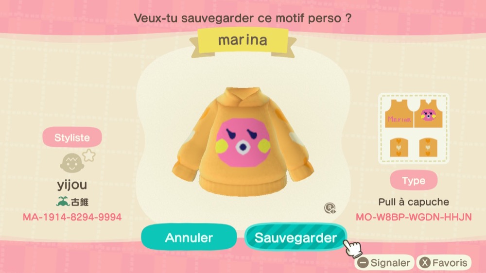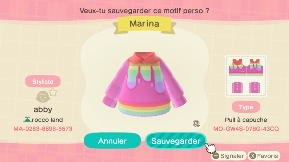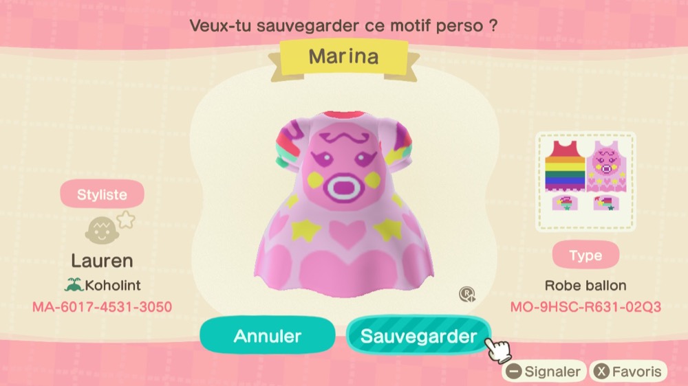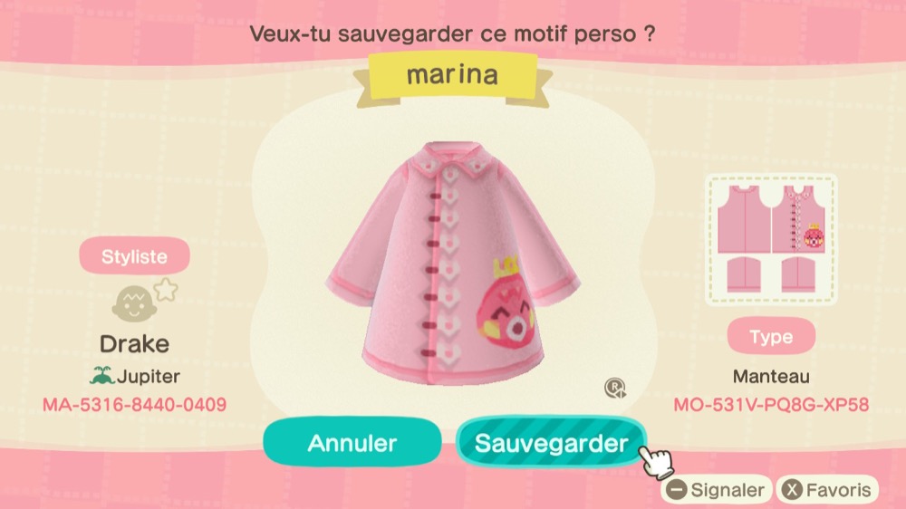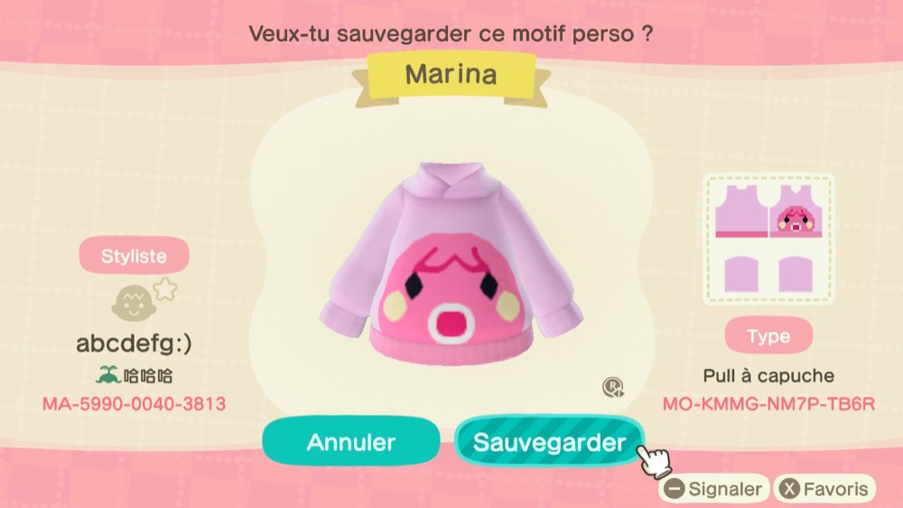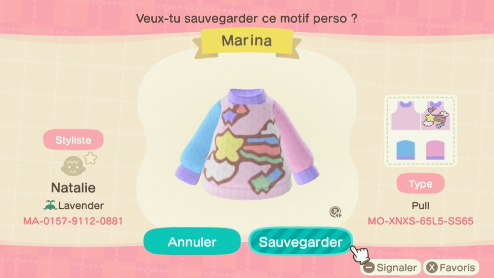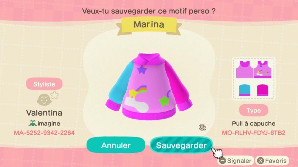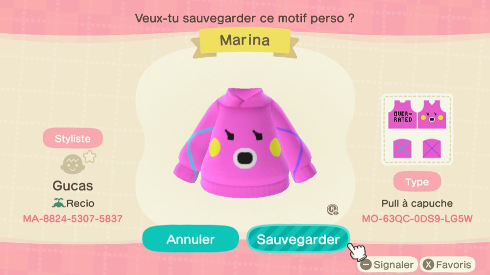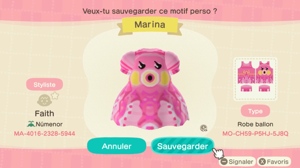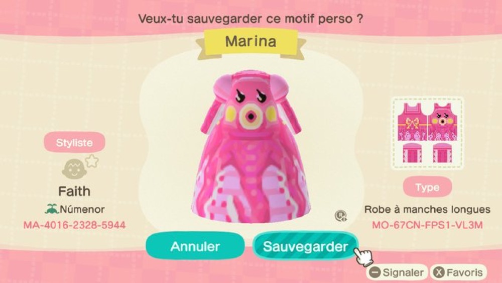 Dans le jeux video Animal Crossing New Horizons, vous povez télécharger de nombreux vêtement que la communauté créative et ingénieuse du jeu s’en donne à coeur joie et propose pour habiller vos villageois. Sur Internet, il y a de nombreux de motifs persos inspirés par les Résidents d’île ! Cette fois, C’est au tour de MARINA!!!!