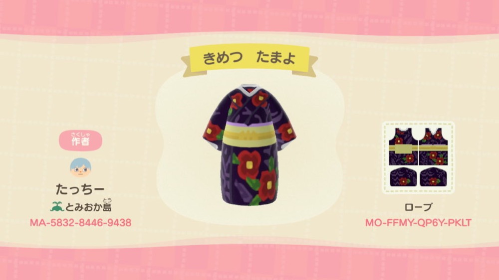 - Les motifs persos de SABITO, MAKOMO et SAKONJI UROKODAKI : Animal Crossing New Horizons
